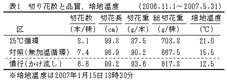 表1 切り花数と品質、培地温度(2006.11.1〜2007.5.31)