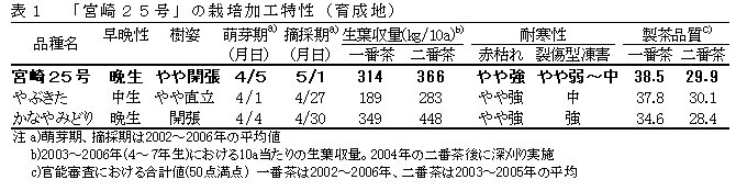 - 「宮崎25号」は、チャの主要病害である炭疽病及び輪斑病に抵抗性を有し、「かなやみどり」より摘採期が1日遅い晩生系統である。製茶品質は「かなやみどり」より優れる。