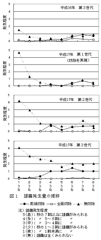 クワシロに対して無防除条件(以下、無防除条件)では、クワシロは世代を経るごとに茶園の端の方から内側部へと広がるが、周縁部を防除することで、茶園内側部でのクワシロの増加をある程度抑えることができる(図1)。