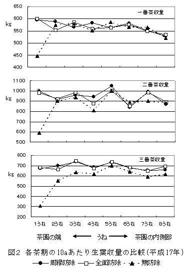 生葉収量は、無防除条件では各うねとも雄繭の発生程度が増加するのに伴い減少するが、周縁部防除では、各茶期ともに全面防除と同程度に維持できる(図2)。