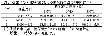 表1 各世代のふ化時期における樹冠内の湿度(平成17年)