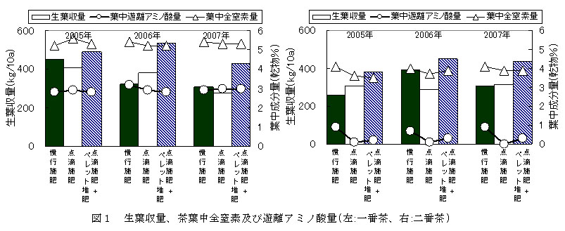 図1 生葉収量、茶葉中全窒素及び遊離アミノ酸量(左:一番茶、右:二番茶)