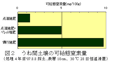 本施肥体系におけるうね間表層土壌中の可給態窒素量は、慣行施肥体系の約半分である(図2)。