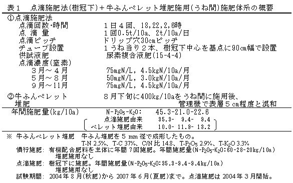 表1 点滴施肥法(樹冠下)+牛ふんペレット堆肥施用(うね間)施肥体系の概要
