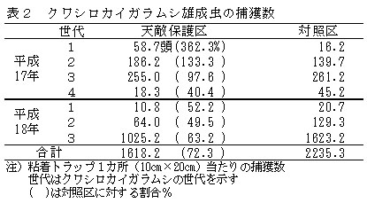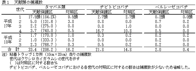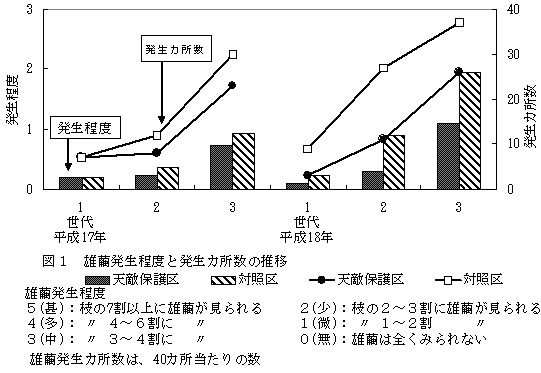 天敵を保護すると、クワシロの密度は対照区の40〜60%程度に抑えられ(表2)、雄繭の発生程度および発生カ所数も減少する(図1)。