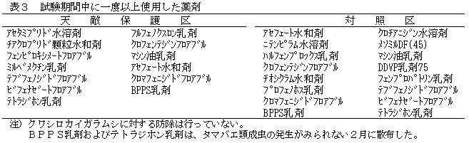 平成16年5月に実施した中切り更新後から試験を開始し、いずれの区もクワシロに対する防除は行わず、他の害虫に対しては表3に示す殺虫剤を用いて防除を実施した結果である。