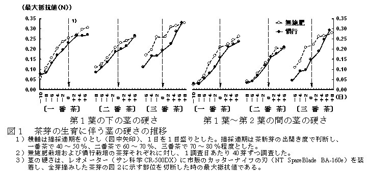 無施肥栽培された茶芽は慣行施肥栽培された茶芽よりも茎が硬く、三番茶ではその傾向が強くなる(図1、図2)。