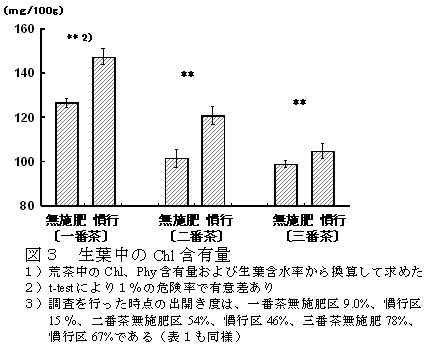 無施肥栽培された茶芽のクロロフィル(Chl)含有量は、慣行施肥栽培された茶芽のクロロフィル含有量より少ない(図3)。