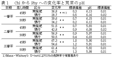 製茶に伴うクロロフィルからフェオフィチン(Phy)への変化率は、慣行施肥栽培された茶芽より大きくなるが、同一茶期において施肥条件が異なっても荒茶のpHに大きな差がないことから、pH以外にもChlからPhyへの変化率に関与する要素があると考えられる(表1)。