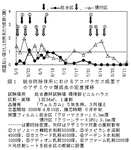 - アスパラガス、半促成長期どり栽培、アザミウマ類、総合防除、近紫外線除去フィルム、要防除密度