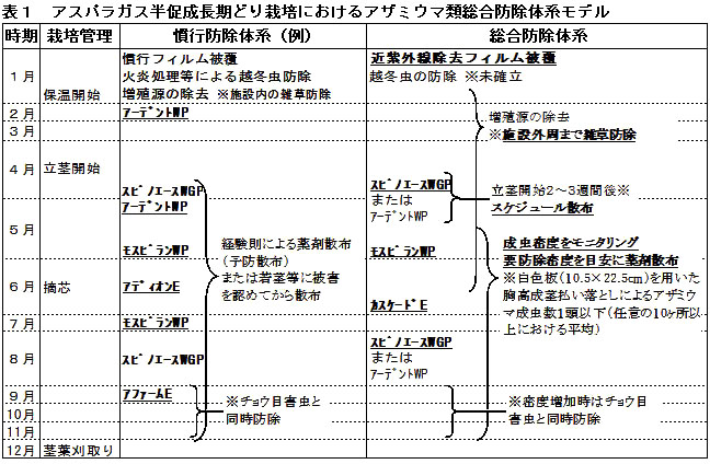 表1 アスパラガス半促成長期どり栽培におけるアザミウマ類総合防除体系モデル