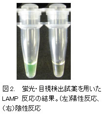 図2 蛍光・目視検出試薬を用いたLAMP反応の結果。