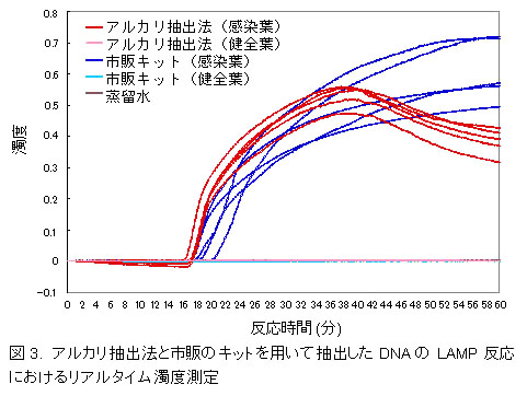 図3 アルカリ抽出法と市販のキットを用いて抽出したDNAのLAMP反応におけるリアルタイム濁度測定