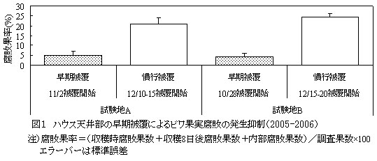 図1 ハウス天井部の早期被覆によるビワ果実腐敗の発生抑制(2005-2006)