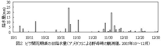 図2 ビワ開花期頃の日降水量(アメダスによる野母崎の観測値,2005年10〜12月)