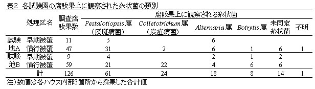 表2 各試験園の腐敗果上に観察された糸状菌の類別