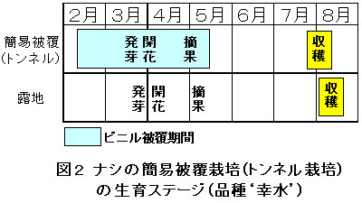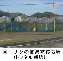 - 九州地域のナシ栽培では、品種「幸水」を中心に早期出荷を目的として、生育初期(2月中旬〜5月中旬)のみをビニル被覆する簡易被覆栽培(トンネル栽培)が広く普及している。