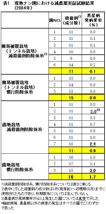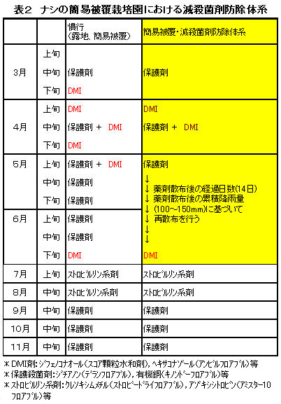 表2 ナシの簡易被覆栽培園における減殺菌剤防除体系