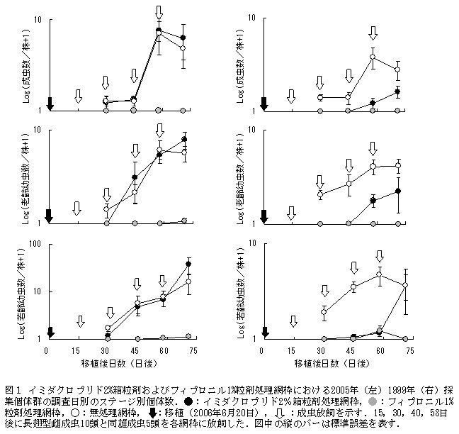 フィプロニル処理区では2005年個体群放飼網枠、同1999年個体群放飼網枠ともに、移植58日後から若齢幼虫の寄生が認められる。しかし、成幼虫密度は78日後まで低密度で推移しており、フィプロニル1%粒剤の残効期間は採集年次に関係なく58日である(図1)。
