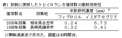1999年採集個体群に比べて2005年採集個体群の薬剤感受性は、フィプロニル剤で同等、イミダクロプリド剤でやや低下している(表1)。