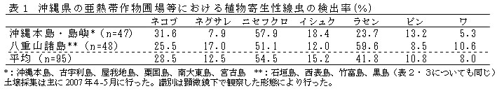 表1 沖縄県の亜熱帯作物圃場等における植物寄生性線虫の検出率(%)