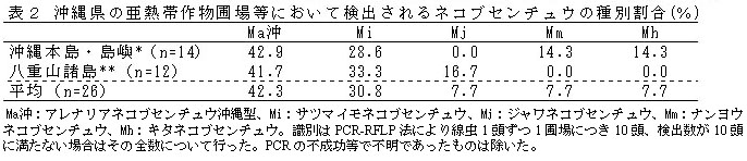 検出されたネコブのうち、アレナリアネコブ沖縄型は平均42.3%を占める。次いでサツマイモネコブが30.8%である。ナンヨウネコブ、ジャワネコブ、キタネコブはそれぞれ2ヶ所ずつで検出され、キタネコブ(今帰仁村古宇利島)は県下における初検出である(表2)。