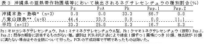 表3 沖縄県の亜熱帯作物圃場等において検出されるネグサレセンチュウの種別割合(%)