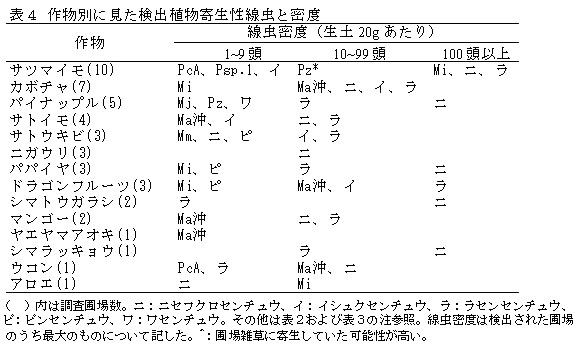 寄主別にみた場合、サツマイモではネコブおよびネグサレ、カボチャ、ウコン、アロエ、ドラゴンフルーツではネコブの密度が生土20gあたり10頭以上検出される圃場があり、これら線虫の寄主として好適である(表4)。