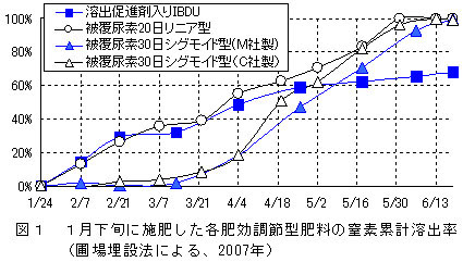 図1 1月下旬に施肥した各肥効調節型肥料の窒素累計溶出率(圃場埋設法による、2007年)