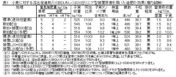 表1 小麦に対する溶出促進剤入りIBDUもしくは20日リニア型被覆尿素を用いた追肥の効果(場内試験)