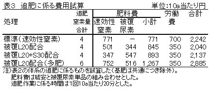 追肥に係る費用について同じ窒素施肥量の体系間で比較すると、肥料費は肥効調節型肥料を用いた体系が高くなるが、労働費を含めると遜色ない(表3)。