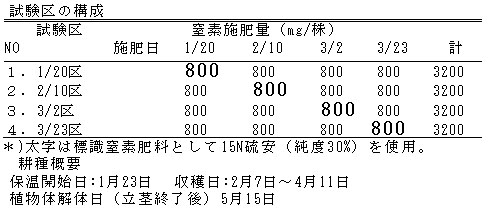 部位別にみると1月20日、2月10日の施肥窒素は根に最も多く吸収利用されている。後半の施肥の3月2日、3月23日の施肥窒素は立茎葉に最も多く吸収利用されている。(表2)。