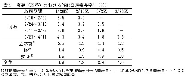 2月10日から4月11日にかけて収穫した春芽の若茎において、1月20日に施肥した窒素は他の施肥日に比べ施肥窒素寄与率が高い(表1)。