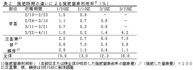 施肥時期別にみると、立茎終了時点での株全体の施肥窒素の利用率は各区それぞれ12〜17%程度と低い(表2)。