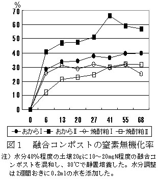 1ヶ月後の培養による窒素無機化率は、おから、麦わら、牛ふんの組合せでは60%、おから、木材チップ、牛ふんの組合せでは40%、焼酎粕を原料とする組合せでは30%である(図1)。