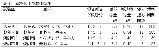 製造過程において、原料がおからの場合、切り返しを12回行い、209日堆積すると炭素率7.4〜9.0のものができる。原料が焼酎粕の場合、切り返しを8回行い、182日堆積すると炭素率10.6〜11.3のものができる。そのときの発芽率はおから、木材チップ、牛ふんの組合せおよび焼酎粕を原料とする組合せでは100%、おから、麦わら、牛ふんの組合せでは96%である(表1、表2)。