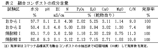 - おからと木材チップおよび牛ふんを原料にした融合コンポストは炭素率は9.0で焼酎粕を原料にしたものは炭素率10.6〜11.3でいずれも発芽率は100%である。また前者は大豆に対して慣行栽培以上、後者は水稲に対して慣行栽培とほぼ同等の施用効果を示す。
