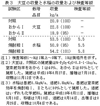 大豆の収量は慣行の化学肥料施肥に比べて、おから、木材チップ、牛ふんの組合せでは増収となる。おから、麦わら、牛ふんの組合せでは慣行の化学肥料施肥とほぼ同等となる。水稲の収量および検査等級は、焼酎粕、麦わら、牛ふんの組合せおよび焼酎粕、木材チップ、牛ふんの組合せでは慣行の化学肥料施肥とほぼ同等となる(表3)。