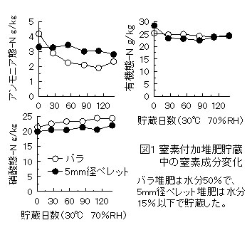 供試した窒素付加堆肥の全窒素含量は4.01〜4.45%で、その約半分は無機態窒素でその大半が硝酸態窒素である(表1)。窒素とカリの有効成分含量比は1に近く、一般の牛ふん堆肥に比べて養分バランスが良い。