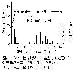 図2 ハクサイ栽培期間中の窒素付加堆肥からの窒素溶出率*並びに期間中の降水量