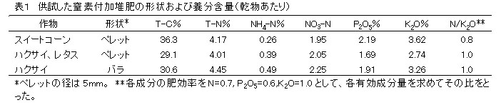 表1 供試した窒素付加堆肥の形状および養分含量(乾物あたり)