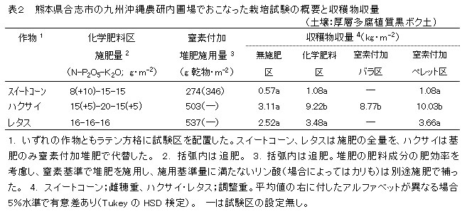 本堆肥を窒素肥効率に基づいて施用したとき、基肥として施用量は274〜537kg乾物/10aとなる。このときのスイートコーン、冬どりハクサイ並びに秋レタスの収穫物収量は化学肥料区と同等である。(表2)。