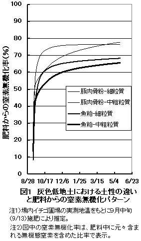 得られた無機化特性値を基に、イチゴ栽培に基肥として施用する場合の肥料からの窒素化を推定すると、魚エキスで80〜85%、豚肉骨粉で78%程度、菜種油粕で約70%、魚粕で約67%の窒素が供給される(図1、一部データ省略)。土性の違いによる最終的な窒素無機化率に差は無いが、中粗粒質に比べ細粒質で無機化が速く進み、窒素無機化パターンが異なる。