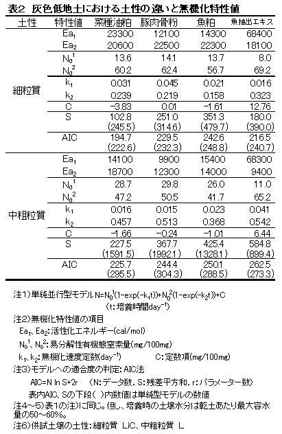 一方、中粗粒灰色低地土では、菜種油粕、豚肉骨粉、魚粕、魚エキスは、単純型より単純並行型の無機化モデルに適合する(表2)。