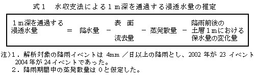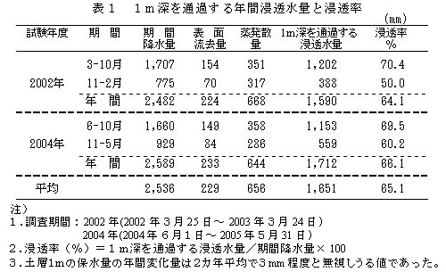 1m深を通過する浸透水量は、調査2カ年の平均で1,651mmと推定され、年間降水量2,536mmの約65%に相当する(表1)。