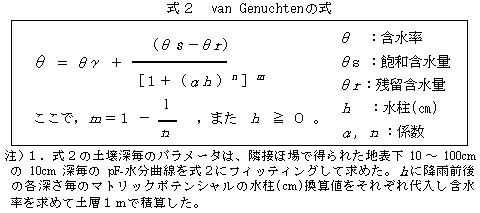 - 対象土壌における1m深を通過する浸透水量は、土層1mの保水量を考慮した水収支法(式1)により推定する。土層1mの保水量の変化量は、地表下10〜100cmの10cm深毎のマトリックポテンシャルの実測値から、van Genuchten(1980)式(式2)を用いて、それぞれの体積含水率を求めて、対象とする解析期間前後の差として算出する。