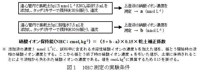 - 土壌中の硝酸態窒素の挙動は、土壌の陽荷電による硝酸イオン保持能に影響されるため、硝酸イオン保持能の解明は環境保全的な土壌管理を行う上で重要である。しかし硝酸イオン保持能の目安となる陰イオン交換容量(AEC)は測定に多大な時間と労力を要する上、AEC測定で評価される全陽荷電が硝酸イオン保持に寄与する訳ではない。そこで硝酸イオンの添加実験により、土壌の硝酸イオン保持能(以下NHC:Nitrate