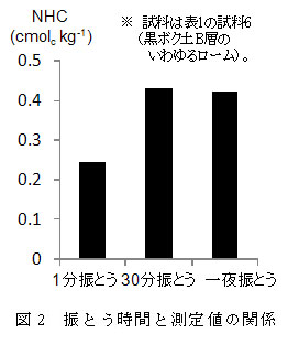 この方法で用いる溶液の濃度や固液比は、日本の畑土壌における土壌溶液の硝酸イオン濃度や黒ボク土の飽和容水量に近い。また希薄な中性塩溶液を用いるため抽出液pHは土壌pHと大差がなく(表1)、圃場条件に近い状態での測定ができる。振とう時間は30分で充分であり(図2)、オートアナライザーを使用すれば全操作は3時間以内で完了する。NHCが0.1cmolc kg-1以上なら3連の平均誤差が6%以下と、繰り返し精度は良好である。