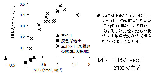 黒ボク土を主体とする試料19点のNHCとAECを測定すると、両者には密接な正の関係が見られる(図3)。NHCの値は同じ試料のAECに比べて低く、特にAECが0.5cmolc kg-1以上の試料では、NHCはAECの25%〜63%の値にとどまる。これはAECの多くが、硝酸以外の陰イオンに競合的に占められているためと考えられる。