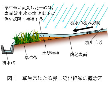 沖縄地方では、降雨時に国頭マージ土壌の畑地で発生する土砂流出(赤土流出)が下流域や沿岸域での環境劣化の一因といわれており、赤土流出軽減対策が急務である。これまで、センチピードグラスを用いた草生帯は、畑地からの赤土流出軽減に有効であると報告されている(図1)。しかし、草生帯の設置により畑地の作付面積が減少するため、最小限の面積で最大限の効果を発揮する効率的な草生帯の規模を決定する必要がある。